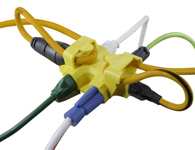 Wood Industries offers a safety yellow 5-Outlet Adapter under the Yellow Jacket brand name. It's an outdoor-rated electrical "in-line" device equipped with 5 outlets. The in-line design means it could connect two extension cords